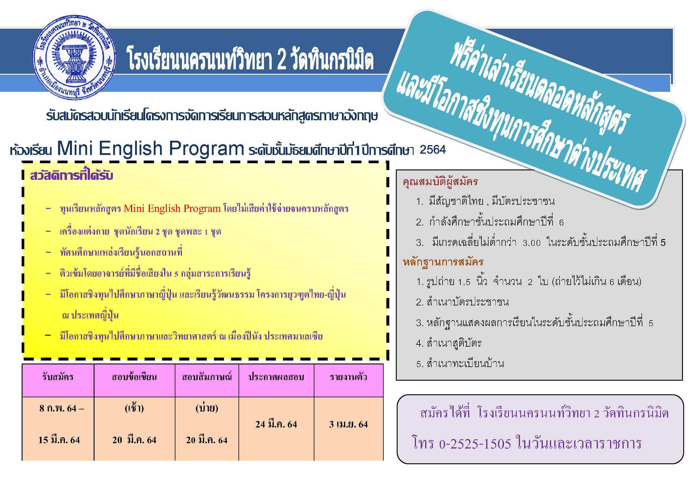 โรงเรียนนครนนท์วิทยา ๒ วัดทินกรนิมิต รับสมัครเข้าศึกษาต่อชั้นมัธยมศึกษาปีที่ ๑ ปีการศึกษา ๒๕๖๔ แผนการเรียนห้อง MEP โครงการจัดการเรียนการสอนหลักสูตรภาษาอังกฤษ ห้องเรียน Mini English Program