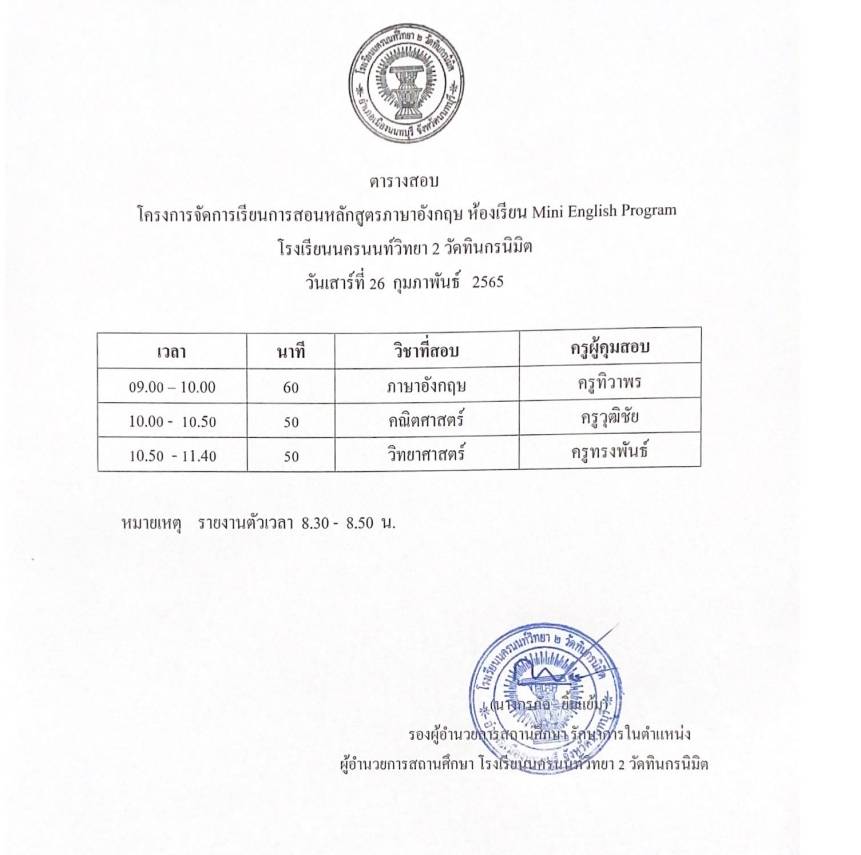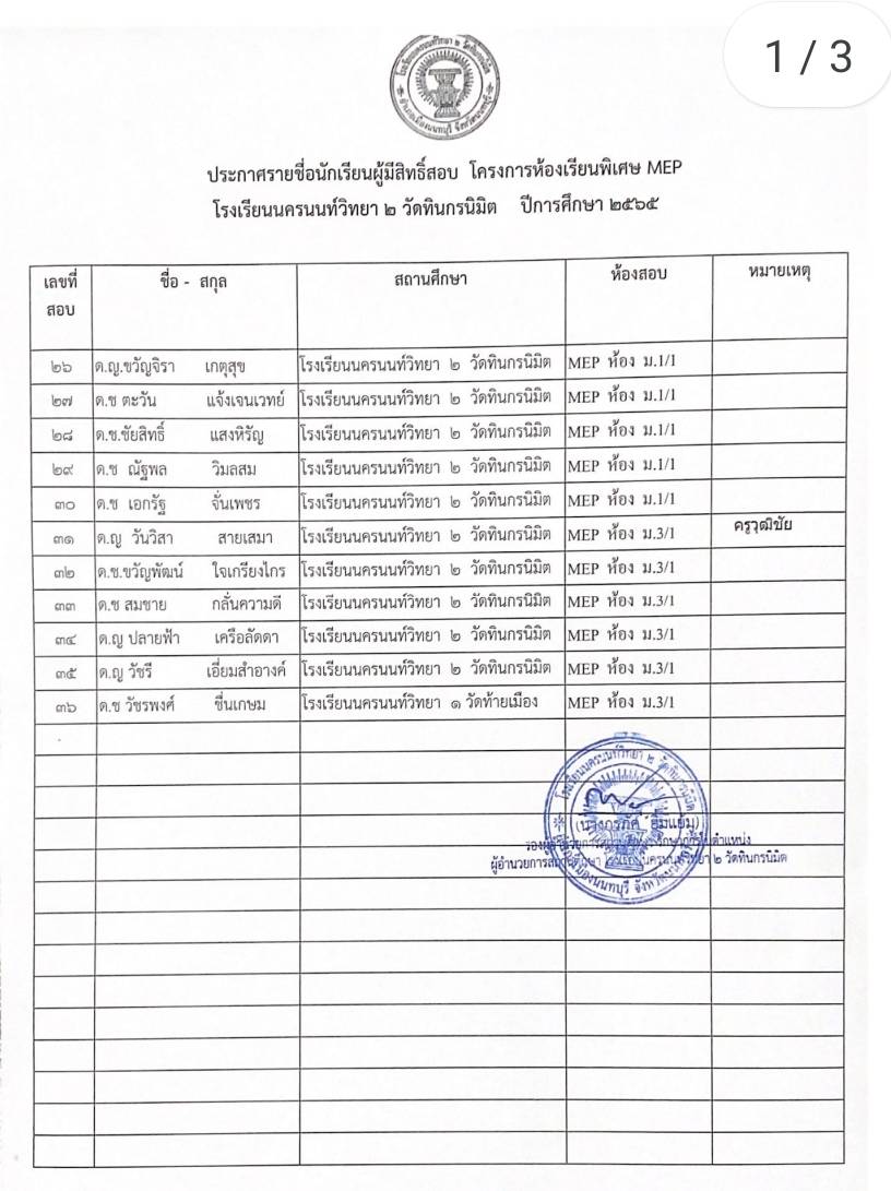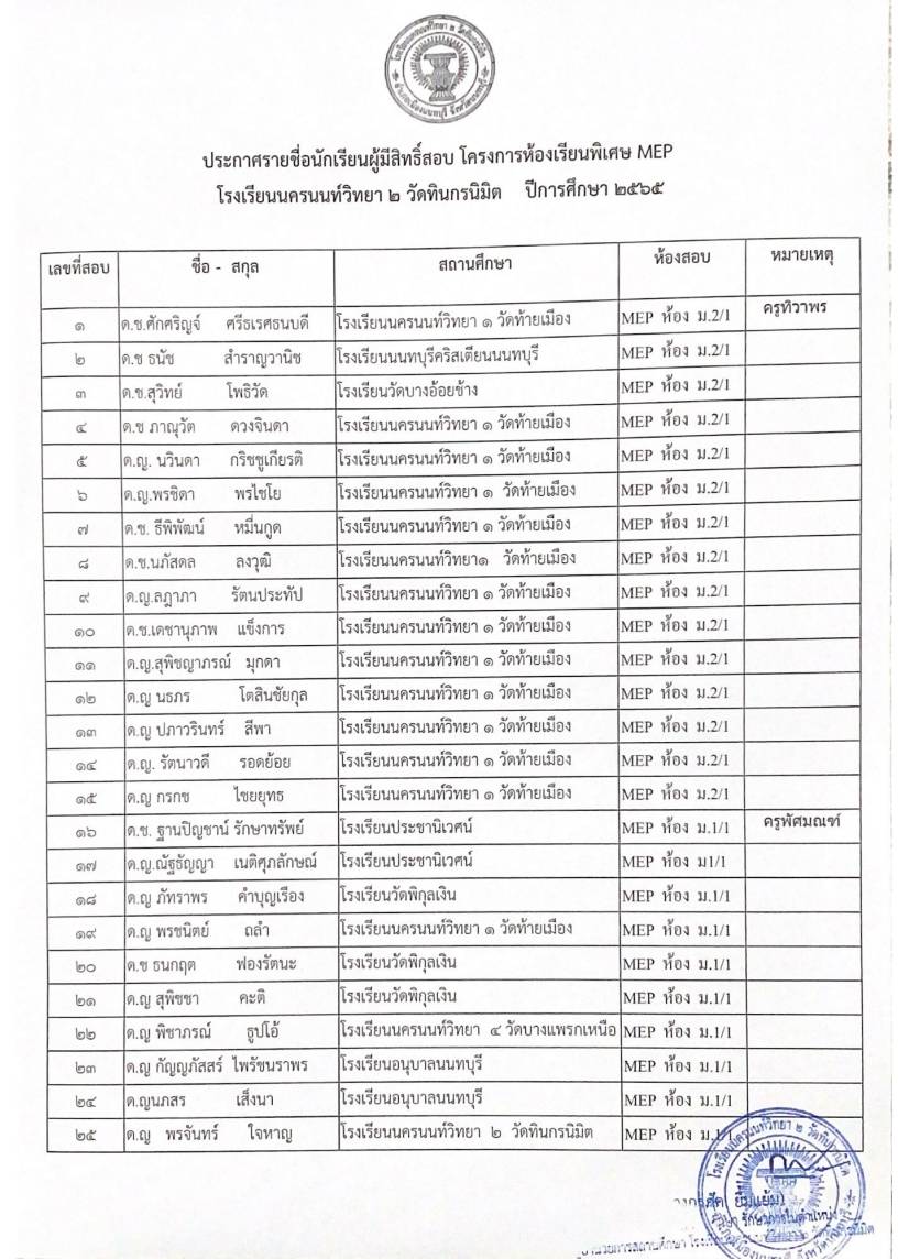 **ประกาศรายชื่อผู้มีสิทธิ์สอบและตารางสอบ โครงการห้องเรียน? MEP โรงเรียนนครนนท์วิทยา 2 วัดทินกรนิมิต ปี 2565