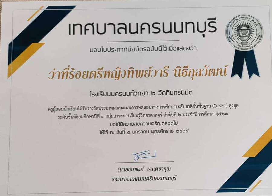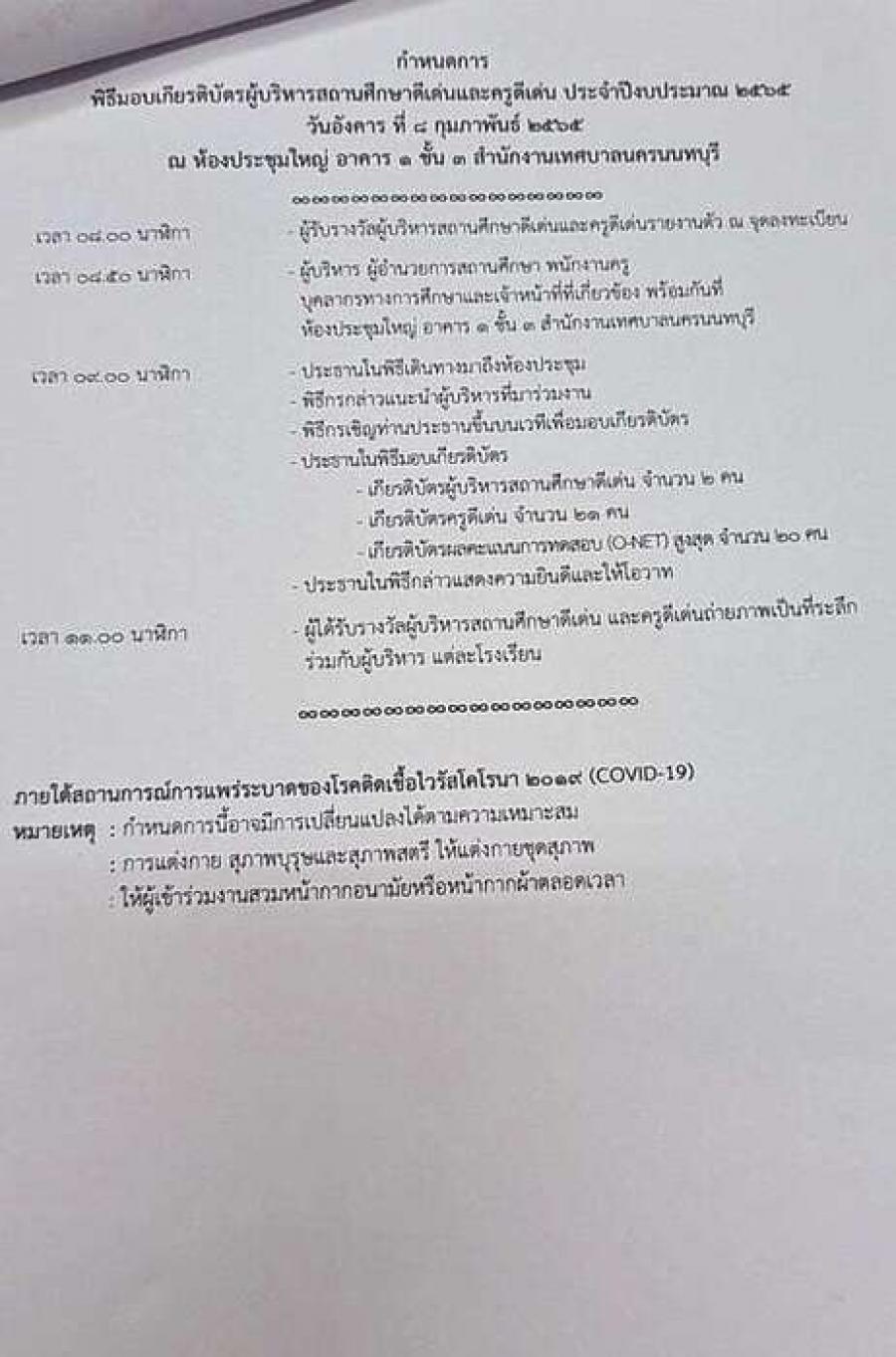 พิธีมอบเกียรติบัตร ผู้บริหารสถานศึกษาดีเด่นและครูดีเด่น ประจำปีงบประมาณ พ.ศ. 2565 พร้อมมอบรางวัลการทดสอบทางการศึกษาระดับชาติขั้นพื้นฐาน (O-NET) สูงสุดปี 2563 ณ ห้องประชุ มใหญ่ อาคาร 1 ชั้น 3 สำนักการศึกษาเทศบาลนครนนทบุรี S:0